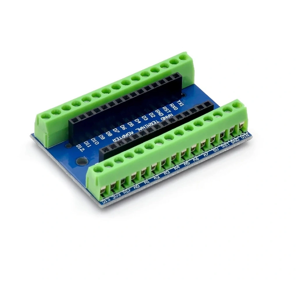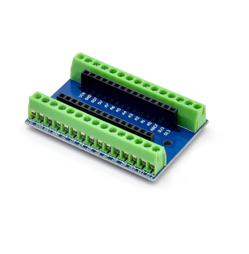 Arduino Nano 3.0 bağlantılarını rahatça yapabileceğiniz ve kablo karışıklığa son verecek son derece kullanışlı genişleme kartıdır. 2 adet 15 pin dişi header sokete nano 3.0 takılır. Kartın 2 kenarında 3.5mm 15li klemens soketler bulunmaktadır. Bu soketler arduinonun tüm pinlerine bağlıdır. Harici devrelerle çok kolay ve hızlı şekilde bağlantı kurabilirsiniz. Küçük yapısı ve lehimsiz işlem yapılabilmesi imkanı vardır.