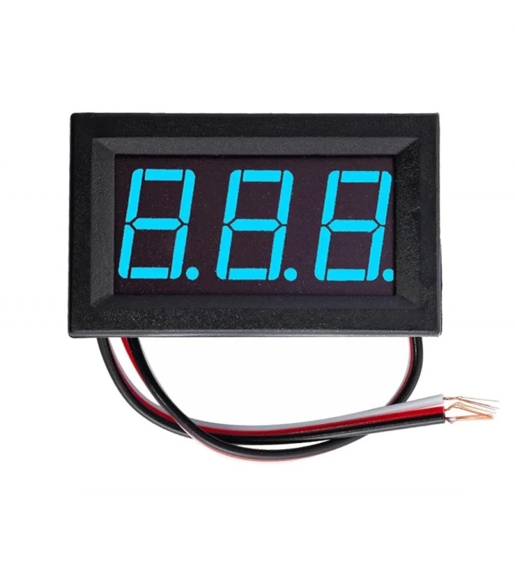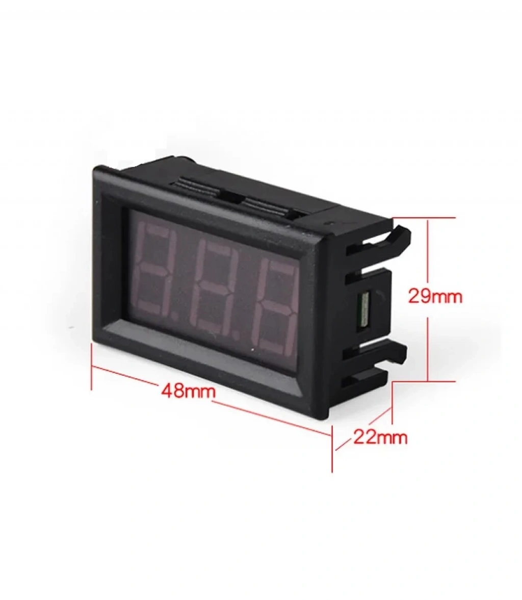 Özellikler Çalışma Voltajı: DC 4.5-100V ( Daha yüksek voltajlarda ürün bozulur. ) Ölçme voltaj aralığı : DC 0-100V Hassasiyet: 1% Yenileme Hızı : 500ms Çalışma akımı: 20mA den az Panel tipi plastik kutu 3 hane 0.56 inh ekran Display Rengi: Mavi Çalışma Sıcaklığı: -10°C – 65°C Boyutlar: 48mm x 29mm x 22mm