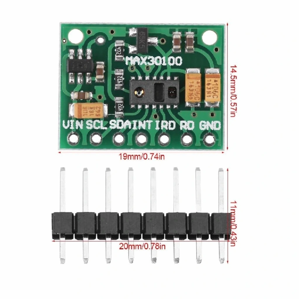 Bu modül, Maxim'in geliştirdiği MAX30100 entegre nabız oksimetresi ve kalp atış hızı sensörünü içermektedir. Optik bir sensördür ve iki dalga boyundaki ışığı (kırmızı ve kızıl ötesi LED'ler) kullanarak parmak ucu veya benzeri bölgelerden gelen verileri okur. Kan dolaşımındaki emilimi ölçer ve bu verileri fotodetektöre iletir.