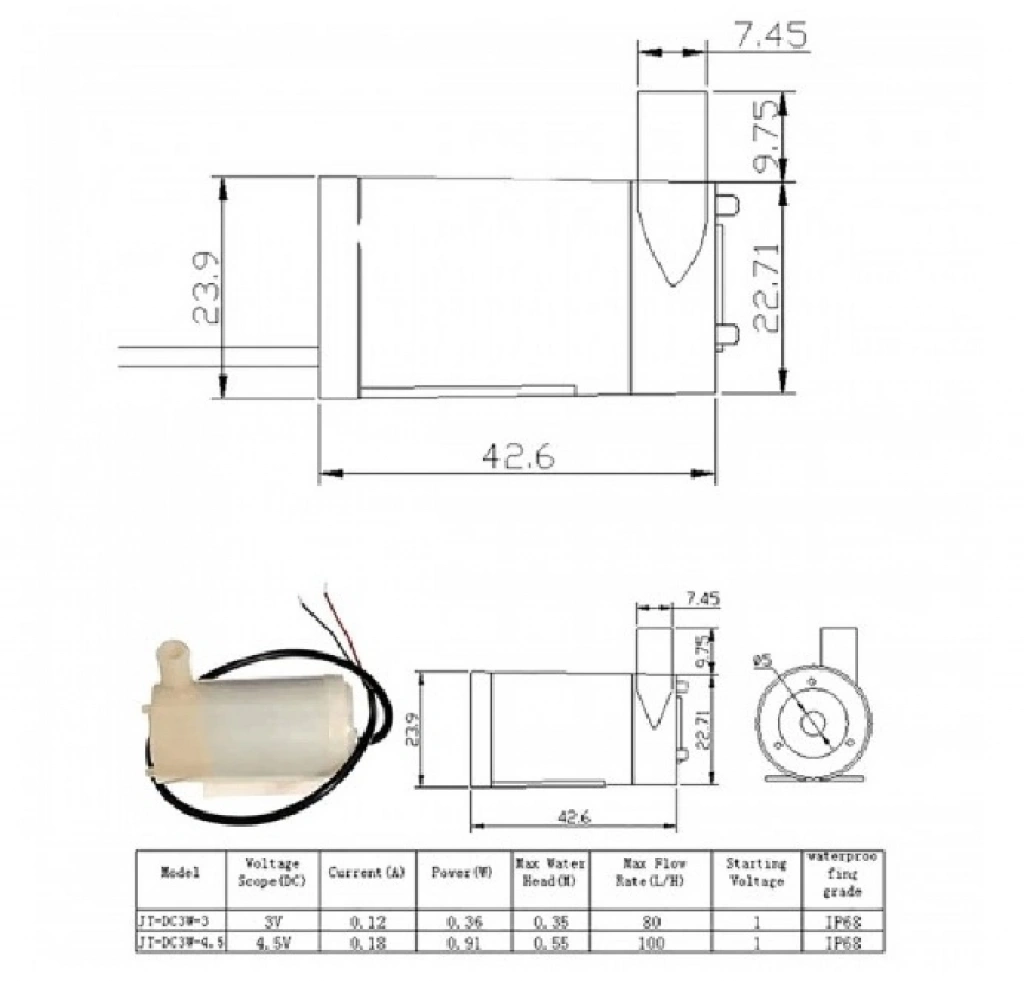 Çok sessiz çalışan düşük güç tüketimine sahip olan su geçirmez su motoru ile yağ e su gibi sıvıları saatte 120 litreye kadar aktarabilirsiniz. IP68 standart a sahip bu ürün su ve toz geçirmemektedir.