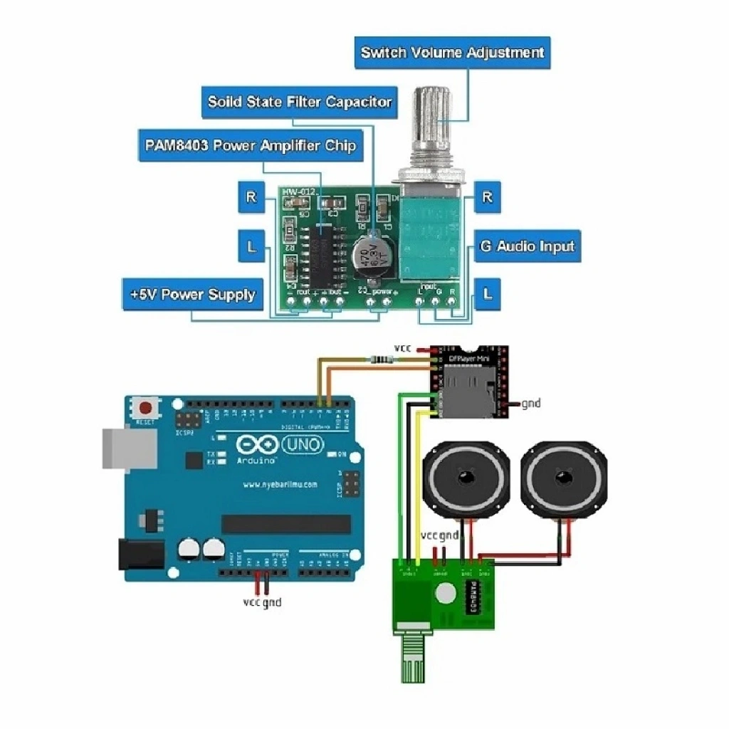 NOT : 5,5V üzerinde voltajlarda modül bozulur. Ters voltajda modül bozulur. Sol ve sağ pinler ses girişidir. Orta uç toprak ucudur. Hatalı bağlantı ürüne zarar verebilir.
