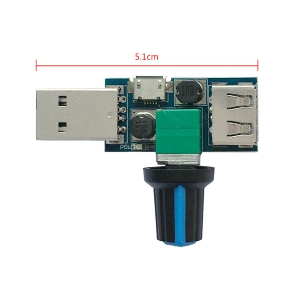 USB girişli fanlarınızda bu kart yardımıyla hız kontrolü yapabilirsiniz. USB girişinden aldığı 5VDC sinyali 2.5v-8V arasında çıkış olarak verebilmektedir. Mikro USB girişinden 4v -12V arasında aldığı sinyali 2.5V ile 8V arasında çıkış sinyali olarak verebilmektedir. Fan kontrolcüsü olarak değil de 2.5V - 8V arasında PWM üreteci olarak kullanabilirsiniz. Piyasadaki en yaygın 5V USB fanlar için uygundur. Kademesiz hız ayarı yapabilme yeteneğine sahiptir. Saat yönünde döndürme fan hızını arttırır, saat yönünün tersinde fan hızının azaltır. Fanı tamamen kapatabilme yeteneği ile USB sök, tak problemi olmaz.