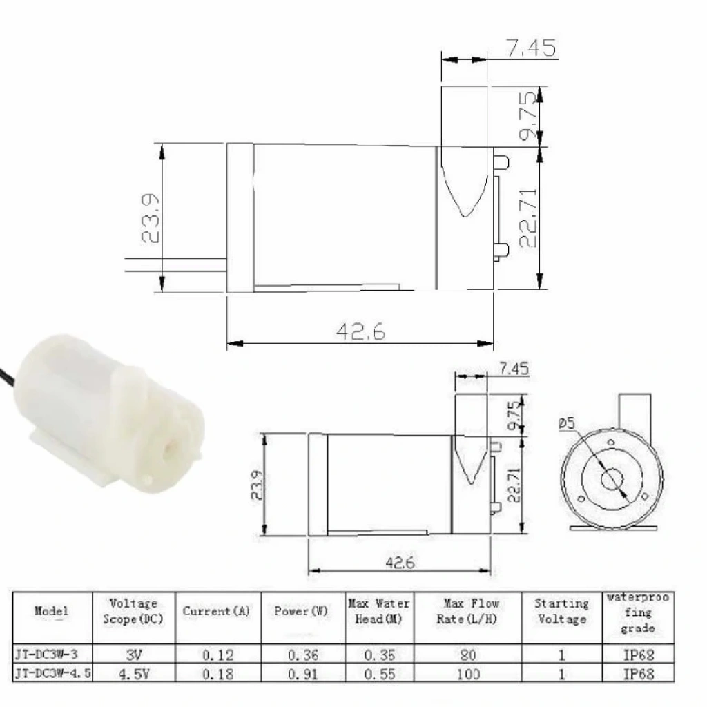 5V Mini dalgıç motorunu, 5V bir usb girişinden, yada USB ucu keserek 5v bir kaynak ile artı ve eksi uçları bağlayarak kullanabilirsiniz. Ip68 su geçirmezliğe sahiptir. Mini dalgıç su pompası 3V ile 6VDC gerilim arasında çalışmaktadır. Ip68 su ve toz geçirmezlik özelliği bulunmaktadır. Genel amaçla bir çok projede kullanıma uygundur. Paket içerisinde su hortumu bulunmamaktadır.