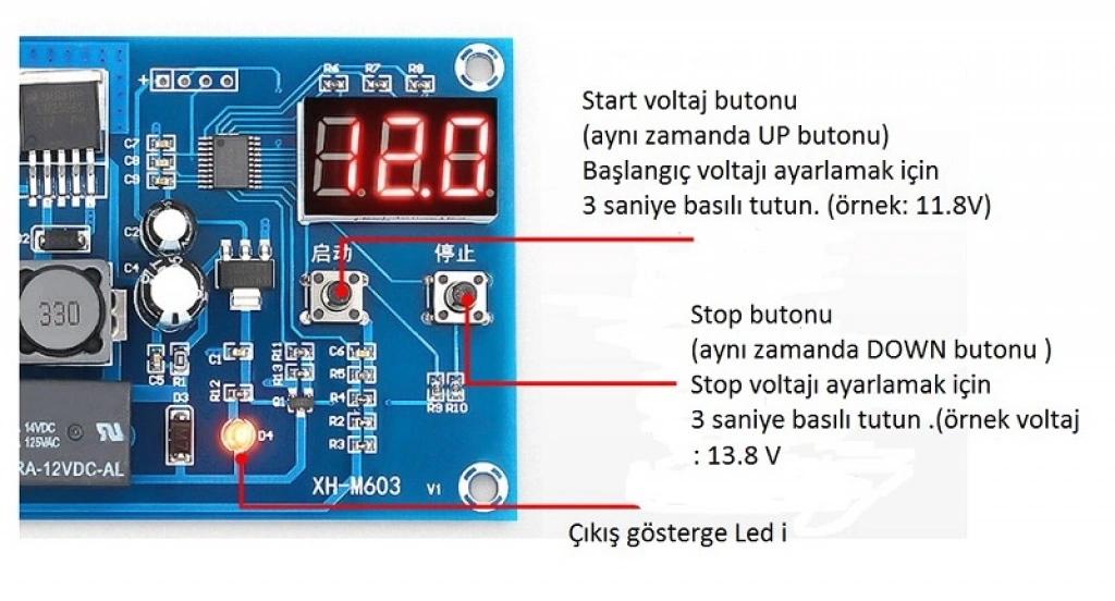 Sol butona uzun basarsanız başlangıç voltajını ayarlarsınız. Sağ butona uzun basarsanız bitiş voltajını ayarlarsınız. Voltaj ayarı için ekstra bir tuş bulunmamaktadır. Girişte verdiğiniz gerilime göre çıkışı otomatik olarak ayarlamaktadır. 12V ve 24V bataryalar için verdiğiniz gerilime göre otomatik olarak algılayarak çalışır.